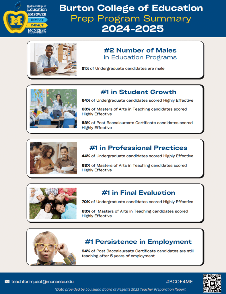 The McNeese State University Burton College of Education was a member of the University of School Partnerships for the Renewal of Educator Preparation (US PREP) Coalition III. As part of the partnership agreement, US PREP and BCOE created surveys administered to candidates completing a teacher education program, mentor teachers of residents, site coordinators, and school principals and district administrators of MSU program completers.