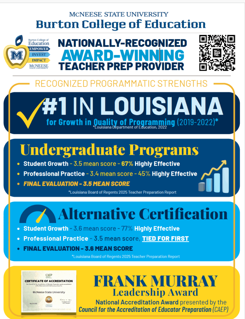 McNeese State University offers nationally accredited initial-certification baccalaureate and post-baccalaureate programs. As a member of the US PREP Coalition III, the Burton College of Education designed a collective system of expert support for teacher candidates around the vision of building effective teacher candidate competencies to meet the needs of all P-12 students. At the advanced level, the Burton College of Education offers a Master of Education degree in Curriculum and Instruction providing each candidate with mentor teacher training, a concentration area add-on, and clock hours applying to the Educational Leader Level 1 (EDL 1) Certificate: Alternate Pathway 2.